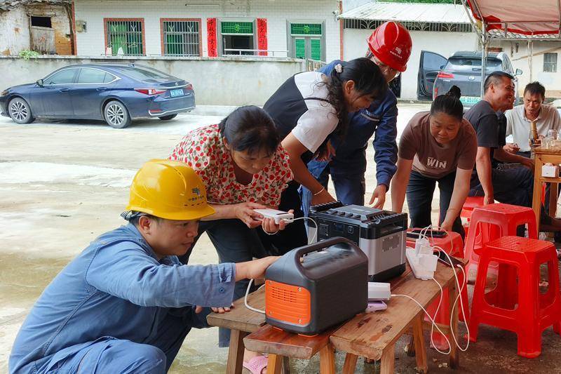 10月6日,陆川供电局大桥供电所第一时间组织客户服务班人员前往10千伏街Ⅰ线王沙公变停电区域,用便携式充电设备及时为村民提供手机充电服务。大桥供电所供图